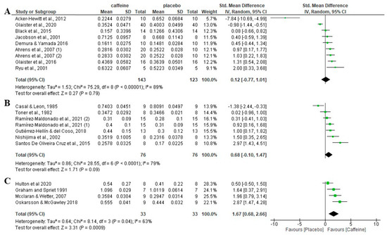 In studies where feeding time between the meal and the onset of exercise was ≤2 h, there was no significant difference between the caffeine placebo condition of fat oxidation rates (p = 0.79), with an SMD of 0.12 and 95% CI −0.77 to 1.01. When the feeding time between the meal and the onset of exercise was >2 h, there was also no significant differences between the caffeine condition and the placebo condition (p = 0.09), with an SMD of 0.68 and 95% CI of −0.10 to 1.47. In those in which the instruction was only to have a meal within the 5 h before exercise, without specific information about the number of hours from the meal to the onset of exercise, there was a significant effect of the caffeine condition on fat oxidation relative to the placebo condition (p < 0.001), with an SMD of 1.67 and 95% CI of 0.68 to 2.66 (Figure 6).