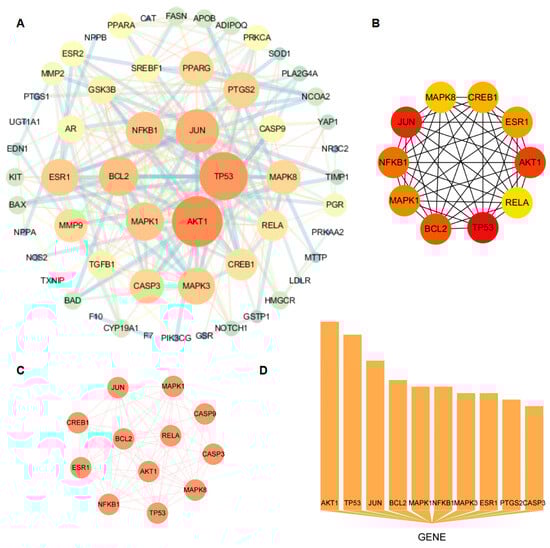 A total of 63 nodes and 242 edges were identified through the analysis of 63 common CRP-T2DOP targets that were imported into the STRING database. As shown in Figure 2A, the protein interaction network diagram was generated by inputting the TSV file containing the analyzed results into the Cytoscape software. The size of the circle represents the degree value of the target, while the strength of the interaction between the two targets is denoted by the thickness of the line connecting them. The core targets in this network were AKT1, TP53, JUN, BCL2, MAPK1, NFKB1, and ESR1, which were determined by the intersection of the calculated results of the “cytoHubba” (Figure 2B) and “MCODE” (Figure 2C) plugins in the Cytoscape software and the top 10 in node counts (Figure 2D).