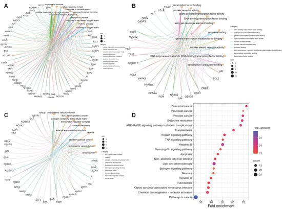 Metascape is the main database for bioprocess annotation and pathway enrichment; it comprises over 40 databases of biological information and is subject to regular updates. The common targets were entered into the Metascape platform (https://metascape.org, accessed on 23 October 2023) for Kyoto Encyclopedia of Genes and Genomes (KEGG) pathway enrichment analysis and gene ontology (GO) bioprocess enrichment analysis [,], selecting the “human” species, ensuring a minimum overlap of 3, setting the p-value at <0.01, and setting the enrichment factor at >1.5. The output files were arranged according to the p-value, and the top ten results were selected according to the molecular function (MF), biological process (BP), and cellular components (CC) as the main biological functions. Likewise, the primary pathway was determined from the top 20 pathways based on the size of the p-value. The analyses of these two components revealed the biological mechanisms and potential pathways that the CRP could potentially use to ameliorate T2DOP. Using the R programming language, the KEGG pathway enrichment analysis and GO analysis were subsequently visualized.
