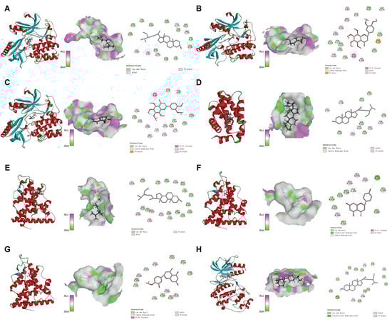 The eight sets of docking maps with the best molecular docking results. (A) AKT1-MOL000359; (B) AKT1-MOL005815; (C) AKT1-MOL005828; (D) BCL2-MOL000359; (E) ESR1-MOL000359; (F) ESR1-MOL004328; (G) ESR1-MOL005100; (H) MAPK1-MOL000359.