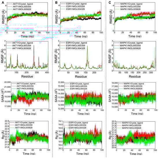 MD simulation of target proteins with bioactive compounds. (A) AKT1; (B) ESR1; (C) MAPK1.
