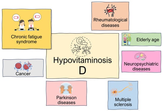 Since vitamin D levels have been linked to many serious pathological conditions, both neurological and autoimmune, the opportunity for vitamin D supplementation in these patients has been considered. However, data supporting this hypothesis are controversial. The role of vitamin D in fatigue related to specific diseases and conditions is explored in further sections (Figure 2).