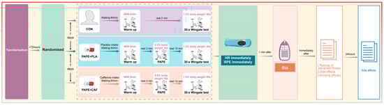 The three conditions under experimentation were as follows: (i) control (CON), which involved no substance intake and no PAPE protocol before the Wingate Anaerobic Test; (ii) PAPE + PLA, which involved a placebo intake 60 min before and a PAPE protocol comprising a 10 s cycling sprint overloaded with 8.5% of the participants’ body weight 10 min before the Wingate test; and (iii) PAPE + CAF, the intake of 3 mg/kg of caffeine 60 min before and the same PAPE protocol used in the (ii) protocol 10 min before the Wingate test. (Figure 1). In all conditions, the participants performed a 5 min warm-up and then performed the 30 s version of the Wingate Anaerobic Test with a load equivalent to 7.5% of their body weight while the cycle ergometer setting was replicated. Immediately following the Wingate test, heart rate (HR) and the rating of perceived exertion (RPE) were measured, whereas blood samples were obtained 1 min after the Wingate test to assess blood lactate concentration (Bla). All trials were performed in a laboratory with controlled ambient temperature and humidity (24 ± 1 °C and 43 ± 2%, respectively). The primary outcomes for this study were power parameters derived from the Wingate test. Secondary outcomes involved pertinent physiological parameters such as HR, RPE, and Bla and other parameters such as subjective perceived fitness and prevalence of side effects.