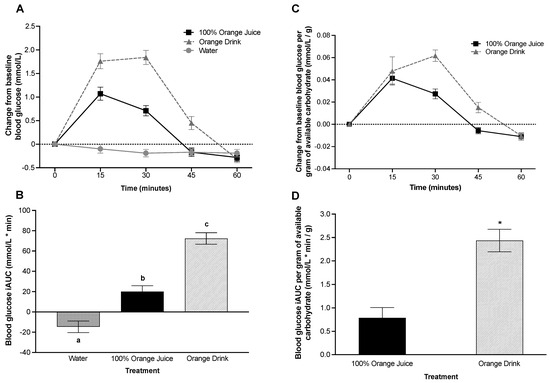 (A) Effect of treatment on change from baseline blood glucose (mmol/L) over 60 min. Blood glucose was affected by treatment (p < 0.001), time (p < 0.001), and treatment-by-time interaction (p < 0.001). Blood glucose concentrations were lower after 100% orange juice compared with orange drink at 15 min (p = 0.001), 30-min (p < 0.001), and 45 min (p = 0.005), but not at 60-min (p > 0.05). (B) Effect of treatment on blood glucose incremental area under the curve (iAUC) (mmol/L * min) over 60 min. Blood glucose iAUC was affected by treatment (p < 0.001). Blood glucose iAUC was lower after 100% orange juice (p < 0.001) and water (p < 0.001) compared with orange drink. Different letters represent significant differences between treatments (p < 0.05). (C) Effect of treatment on change from baseline blood glucose per gram of available carbohydrate (mmol/L/g) from test beverages over 60 min. Blood glucose per gram of available carbohydrate was affected by treatment (p = 0.004), time (p < 0.001) and treatment-by-time interaction (p = 0.015). Blood glucose concentrations per gram of available carbohydrate were lower after 100% orange juice compared with orange drink at 30 min (p = 0.003), but not at 15, 45, or 60 min (p > 0.05). (D) Effect of treatment on blood glucose iAUC per gram of available carbohydrate (mmol/L * min/g) from test beverages over 60 min. Blood glucose iAUC per gram of available carbohydrate was affected by treatment (p < 0.001). Blood glucose iAUC was lower after 100% orange juice (p < 0.001) compared with orange drink. Asterisks represent significant differences between treatments (p < 0.05). All values are means ± SEM, n = 34.