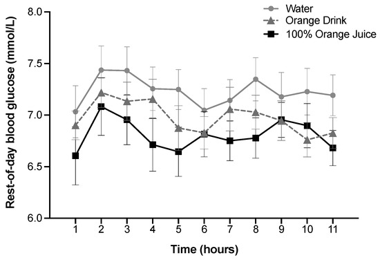 Rest-of-day blood glucose over 11 h was affected by treatment (p < 0.001), but not time or treatment-by-time interaction (p > 0.05). Rest-of-day blood glucose was lower after 100% orange juice compared with the orange drink (p = 0.03) and water (p < 0.001), and lower after orange drink compared with water (p = 0.002) (Figure 2).
