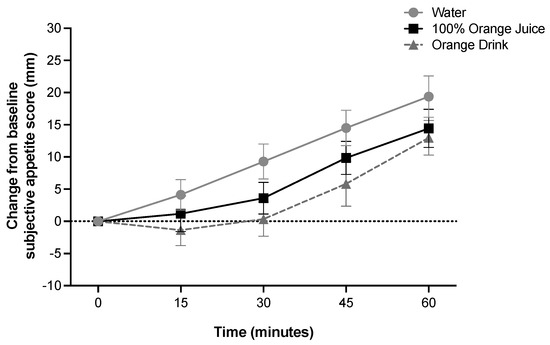 Effect of treatment on change from baseline subjective appetite scores (mm) over 60 min (two-factor ANOVA with Tukey–Kramer’s post-hoc test to account for multiple comparisons). Subjective appetite scores were affected by time (p < 0.001), but not treatment or treatment-by-time interaction (p > 0.05). All values are means ± SEM, n = 36.