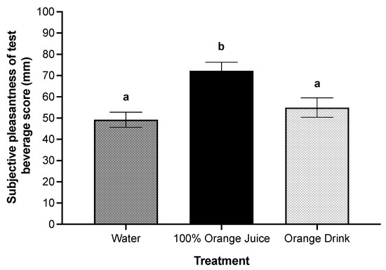 Effect of treatment on subjective pleasantness scores (mm) post-treatment consumption. There was a main effect of treatment on subjective pleasantness of the test beverage (p < 0.001). Subjective pleasantness was higher after 100% orange juice compared with orange drink (p = 0.009) and water (p < 0.001). All values are means ± SEM, n = 36. Different letters represent significant differences between treatments (p < 0.05).