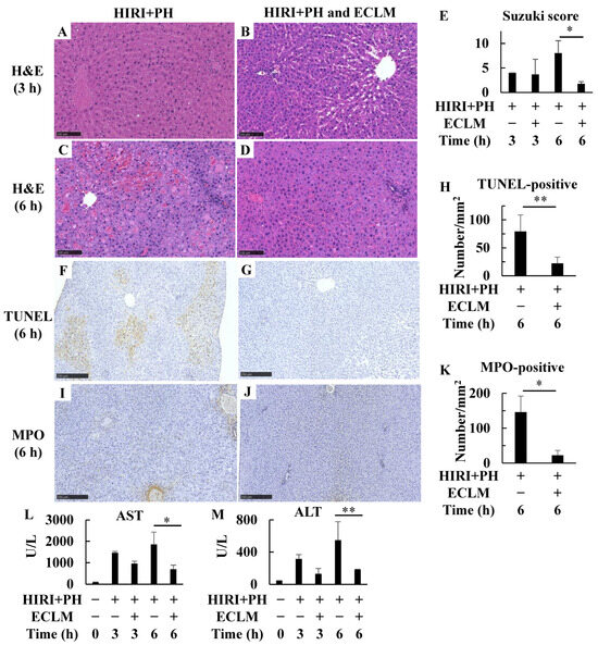 Histological examination of the damage induced by HIRI+PH treatment was performed on rat liver specimens at 3 and 6 h after declamping (Supplementary Figure S1). Figure 1A–D shows representative images of liver sections stained with H&E. Liver damage was characterized by infiltration of inflammatory cells and focal necrosis with hemorrhagic manifestations (Figure 1C). Ballooning degeneration in hepatocytes was also observed. ECLM reduced the incidence and extent of these pathological changes (Figure 1D). Damage was graded using the Suzuki score (Figure 1E), and ECLM significantly decreased liver damage at 6 h. Next, TUNEL staining of the liver sections showed that HIRI+PH increased hepatocyte apoptosis (Figure 1F), whereas ECLM markedly decreased apoptosis (Figure 1G,H). Furthermore, the HIRI+PH treatment markedly increased MPO-positive cells (Figure 1I). In contrast, ECLM significantly decreased MPO-positive cells (Figure 1J,K). A summary of these results is presented in Supplementary Table S2. Furthermore, HIRI+PH treatment increased serum AST and ALT activities, the liver injury markers. In contrast, ECLM administration significantly reduced serum AST and ALT activities (Figure 1L,M).