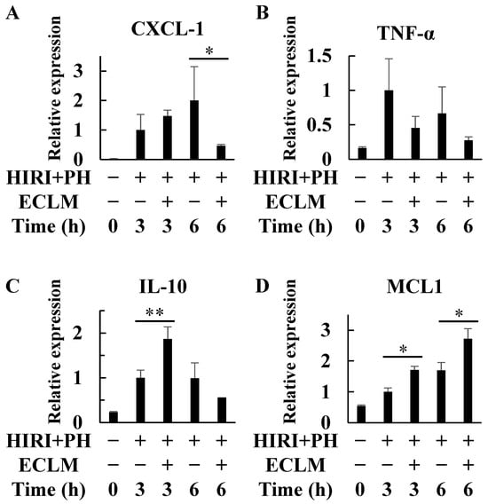HIRI+PH treatment induced the mRNA expressions of several genes related to the inflammatory and apoptotic processes (Figure 2). Since these inflammation- and apoptosis-related genes are thought to directly affect liver injury, those expressions were analyzed at 3 and 6 h after the injury occurred. The mRNA expression levels of C-X-C motif chemokine ligand 1 (CXCL-1), an inflammatory chemokine [29], were increased in rat livers after HIRI+PH treatment, but ECLM significantly inhibited CXCL-1 mRNA expression (Figure 2A). In contrast, ECLM significantly enhanced the mRNA expression levels of interleukin-10 (IL-10), an anti-inflammatory cytokine [30,31], 3 h after declamping (Figure 2C). Moreover, the mRNA expression levels of myeloid cell leukemia1 (MCL1), an anti-apoptotic gene [32], were also significantly enhanced by ECLM (Figure 2D).
