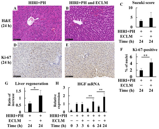 The regeneration of rat livers was investigated 24 h after HIRI+PH treatment. Evaluation of liver injury in the HIRI+PH and ECLM group showed no difference in the Suzuki score compared to the HIRI+PH group (Figure 3C); however, ECLM administration significantly increased the number of Ki-67 positive cells after HIRI+PH treatment (Figure 3F). A summary of the results is provided in Supplementary Table S2. The liver weights in the HIRI+PH and ECLM group were significantly higher than those in the HIRI+PH group (Figure 3G). To evaluate the liver regenerative effects of ECLM on the liver tissues, we assessed continuous changes in hepatocyte growth factor (HGF) mRNA expression levels up to 24 h after treatment. ECLM sustained a significantly higher level of HGF mRNA expression from 6 to 24 h after HIRI+PH treatment (Figure 3H).
