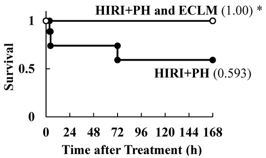 Quantitative results were obtained from three to six rats per group per time-point. The mean values and SDs were calculated. For the comparison between the two groups, Student’s t-test was carried out. One-way analysis of variance (ANOVA) was carried out for multiple comparisons followed by Tukey–Kramer test to analyze differences. The Kaplan-Meier method was used to plot the cumulative survival curves of the HIRI+PH or HIRI+PH and ECLM groups. Meanwhile, the log-rank test was used to compare the difference in survival curves between the two groups. All statistical analyses and cumulative survival curve plots were performed using and JMP 17.2 statistics software (SAS Institute Inc., Carly, NC, USA). * p < 0.05 and ** p < 0.01 versus HIRI+PH alone at each time were considered significant.