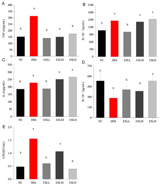 Changes in four serum inflammatory markers and LPS concentrations in mice. (A) TNF-α, (B) IL-1β, (C) IL-6, (D) IL-10 (E) LPS. Data are shown as mean ± SE (n = 5). Based on the ANOVA statistical analysis, the different letters (a, b) above the bars of each group are statistically different (p < 0.05). [Normal Control (NC), Heat stress (HS) model (HSS), HS + Low-dose ESLP gavage (ESLL), HS + Medium dose ESLP gavage (ESLM), HS + High-dose ESLP gavage (ESLH)].