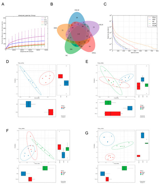 Effects of HS modelling and ESLP treatment on the diversity of gut microbiota in mice. (A) Rarefaction Curve; (B) Venn diagram based on OTU; (C) Rank Abundance curve; (D–G) PCoA analysis of the gut microbiota of mice. Data are expressed as the mean ± SE (n = 5).