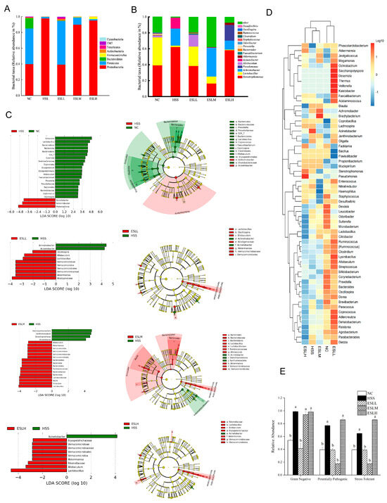 Modelling of the experimental data of the mice gut microbiota. Gut microbiota changes at the phylum (A) and genus (B) levels. The numerous classification units across groups based on the classification hierarchy tree based on the LEfSe and LDA histograms for taxa showed a significant difference between groups (p < 0.05) (C). Horizontal clustering heat map of gut microbiota (D). Comparison of the relative abundance of gram-negative, potential pathogenic, and stress-tolerant bacteria in each group (E). Data are shown as mean ± SE (n = 5). Based on the ANOVA statistical analysis, the different letters (a, b) above the bars of each group are statistically different (p < 0.05). [Normal control (NC), Heat stress (HS) model (HSS), HS + Low-dose ESLP gavage (ESLL), HS + Medium dose ESLP gavage (ESLM), HS + High-dose ESLP gavage (ESLH)].
