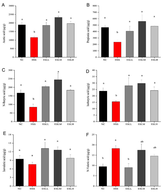 Mice faecal SCFA concentrations. ((A): Acetic acid, (B): Propionic acid, (C): N-Butyric acid, (D): Isobutyric acid, (E): Isovaleric acid, (F): N-Valeric acid). The data are shown as mean ± SE (n = 5). The ANOVA statistical analysis shows that the data with different letters a, b shown on top of each column are statistically different from each other (p < 0.05). [Normal control (NC), Heat stress (HS) model (HSS), HS + Low-dose ESLP gavage (ESLL), HS + Medium dose ESLP gavage (ESLM), HS + High-dose ESLP gavage (ESLH)].