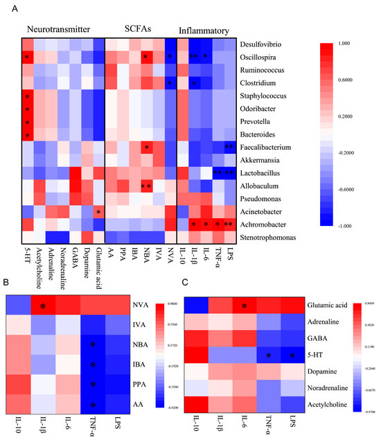 Correlation analysis of inflammatory markers, short-chain fatty acids (SCFAs), neurotransmitters and gut microbiota. (A): Relationship between the gut microbiota and inflammation, neurotransmitters, and SCFAs. (B): Correlation between SCFAs and inflammatory markers. (C): Correlation between neurotransmitters and inflammatory indicators. * p < 0.05, ** p < 0.01. AA: Acetic acid, PPA: Propionic acid, NBA: N-Butyric acid, IBA: Isobutyric acid, IVA: Isovaleric acid, NVA: N-Valeric acid. [Normal control (NC), Heat stress (HS) model (HSS), HS + Low-dose ESLP gavage (ESLL), HS + Medium dose ESLP gavage (ESLM), HS + High-dose ESLP gavage (ESLH)].