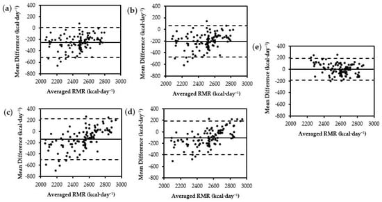 Bland–Altman plots for BM equations: (a) Harris–Benedict, (b) ten Haaf BM, (c) Jagim, (d) Mackenzie-Shalders BM, (e) Tinsley BM, (f) Posthumus BM. The middle, solid, horizontal line represents the constant error. The lower and upper dashed horizontal lines represent the 95% limits of agreement.