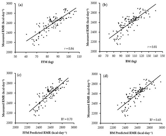 Relationship between (a) fat-free mass (FFM), (b) body mass (BM), and measured resting metabolic rate (RMR). The newly developed (c) FFM and (d) BM prediction equations plotted against measured RMR.