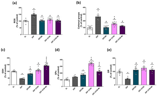 Effect of the CCB, metformin, and their combination on pancreatic oxidative stress. Percentage levels of ROS (a), carbonyl groups (b), GSH (c), GPx activity (d), and GR activity (e) relative to the control condition. Values are expressed as mean ± SEM of n = 6–8 animals. * p < 0.05 vs. ZL; # p < 0.05 vs. ZDF; $ p < 0.05 ZDF (CCB + M) vs. ZDF (M); & p < 0.05 ZDF (CCB + M) vs. ZDF (CCB). ZL: Zucker lean; ZDF: Zucker diabetic rats; ZDF (M): Zucker diabetic rats treated with metformin; ZDF (CCB): Zucker diabetic rats fed with a CCB-rich diet; ZDF (CCB + M): Zucker diabetic rats treated with metformin and fed with a CCB-rich diet.