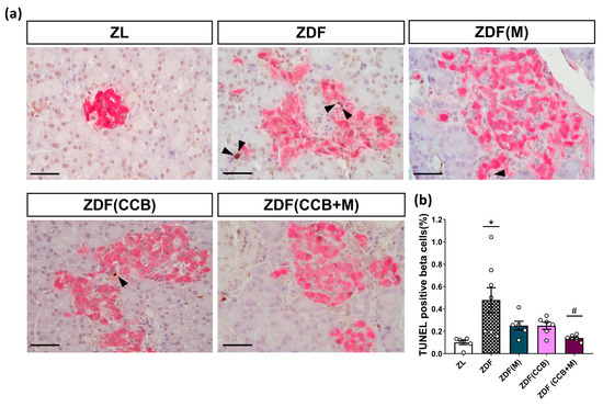 Effect of the CCB, metformin, and their combination on beta-cell apoptosis. (a) Representative immunohistochemical staining of terminal deoxynucleotidyl transferase dUTP nick end labeling-positive beta cells. Scale bar: 50 µm. Arrows indicate apoptotic nuclei (in brown) of pancreatic beta cells (insulin-positive, pink-stained cytoplasm). (b) Beta-cell apoptotic index expressed as the percentage of the total beta cells. Values are expressed as mean ± SEM of n = 6–8 animals. * p < 0.05 vs. ZL; # p < 0.05 vs. ZL: Zucker lean; ZDF: Zucker diabetic rats; ZDF (M): Zucker diabetic rats treated with metformin; ZDF (CCB): Zucker diabetic rats fed with a CCB-rich diet; ZDF (CCB + M): Zucker diabetic rats treated with metformin and fed with a CCB-rich diet.