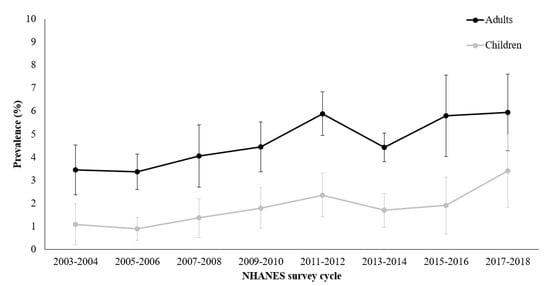 The NHANES is a cross-sectional survey that collects data on health and nutritional status of the noninstitutionalized civilian U.S. population []. The NHANES sample is nationally representative and is selected via complex, stratified, multistage probability cluster-sampling. The current study utilized 2-year NHANES cycles from 2003–2004 through 2017–2018 for the trend analyses. The trend analyses included adults (aged 18 years or older) and children (aged 3–17 years) with data on dietary intake. The resulting sample sizes for adults are 4986, 5060, 5690, 6052, 5076, 5356, 5266 and 4983 in NHANES 2003–2004, 2005–2006, 2007–2008, 2009–2010, 2011–2012, 2013–2014, 2015–2016 and 2017–2018, respectively. Corresponding sample sizes in children are 3025, 3182, 2553, 2699, 2583, 2504, 2432 and 1971. The NHANES protocol has been approved by the National Center for Health Statistics’ Research Ethics Review Board [] and written informed consent was obtained from participants. Since publicly available, de-identified datasets were used in the current research, the study is considered as ‘not human subjects research’ and did not require IRB approval.
