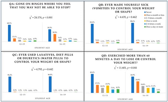 3.5. Behavioural Questions (QA Binge Eating, QB Vomiting, QC Laxatives, QD Exercising) and Age