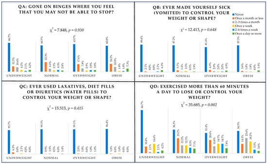 3.6. Behavioural Questions (QA Binge Eating, QB Vomiting, QC Laxatives, QD Exercising) and BMI