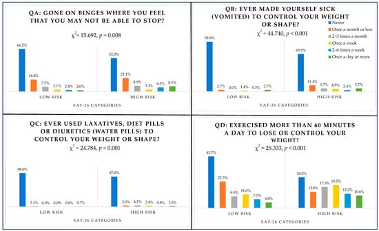 3.7. Behavioural Questions (QA Binge Eating, QB Vomiting, QC Laxatives, QD Exercising) and EAT-26 Scores (High Risk/Low Risk)