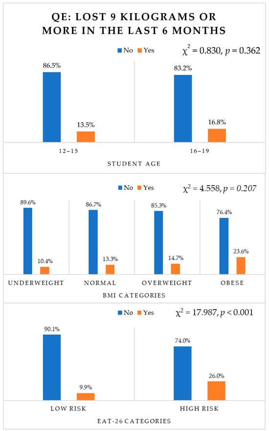As shown in Figure 4, weight loss did not differ significantly across age groups (p = 0.362) and BMI categories (p = 0.207). However, weight loss varied significantly with EAT-26 categories (χ2(1) = 17.987, p < 0.001). Out of the high-risk group, 32 students (26%) reported losing 9 kg or more in the last six months.