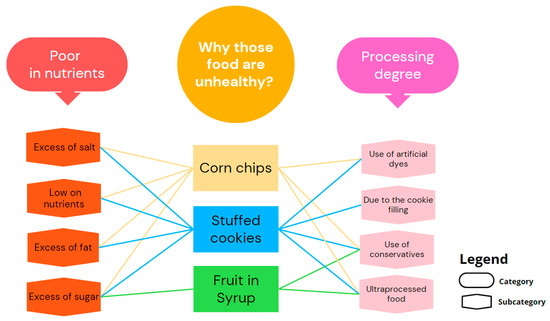 Figure 1 shows two main categories for foods perceived as unhealthy: poor in nutrients and degree of processing. The professionals argued that these foods have excess sugar, fat, or salt; are low in nutrients; and contain artificial dyes and preservatives.