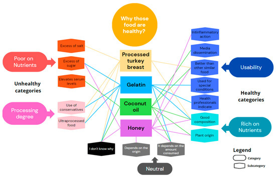 Finally, Figure 3 shows the categories and subcategories that emerged for the perceived healthy foods. As with the foods in the previous question, the perceived healthy foods also provoked ambivalent attitudes. Honey and coconut oil were indicated as being healthy because they are “natural”. It is interesting to compare equivalent foods, such as coconut oil x soybean oil, processed turkey breast x ham, and gelatin x all other ultra-processed foods. For all stereotyped healthy foods, the professionals advocated some health properties that they could not identify in other foods that are very similar. For example, many professionals stated that processed turkey breast and gelatin have good nutritional compositions, but they did not do so for ham or fruit in syrup.