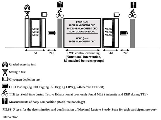 This study used a parallel group design. All participants completed a pre–post-MLSS test intervention and performed a pre–post-intervention test to exhaustion (TTE). The PCHO and the HCHO groups completed the same endurance training program for five consecutive weeks (Table 1) but followed different feeding plans with similar energy intakes. The PCHO group performed 13 “low” sessions with low carbohydrate availability according to the low-intensity training sessions. The participants performed between two and three low-intensity sessions per week based on other studies which found significant changes in performance through this training protocol [,]. Furthermore, nutritional plans were prepared according to the exercise intensity schedule that was prescribed. Low-intensity sessions were performed at the training intensity described as Zone 1 (Z1)–Zone 2 (Z2), which was determined by the exercise intensity below the first lactate/ventilatory threshold, VTL1. Subjects did not have two low-intensity sessions consecutively (Table 1). In contrast, the HCHO group performed all training sessions with high-carbohydrate availability pre-, during and post-training. Both groups also completed nine strength training and thirteen moderate- to high-intensity bike training sessions during the intervention with high carbohydrate availability before, during, and after exercise. The nutritional structure of the feeding plans is described in Table 2. Low, medium, and high carbohydrate intakes were made for each meal depending on the training intensity as described elsewhere [,]. Selected whole-body measures and various strength, submaximal, and maximal performance tests were performed before and after the intervention. The study design is shown in Figure 1.