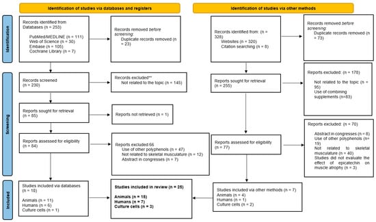 In this context, this systematic review aimed to analyze the existing literature, addressing epicatechin supplementation’s molecular effects and clinical protocol to counteract muscle atrophy in humans, animals, and myoblast cell lines.