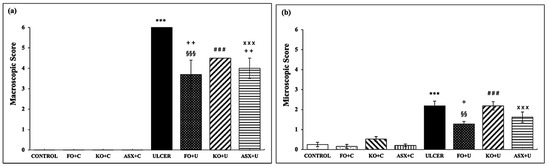 (a) macroscopic score, (b) microscopic score. C: Control, FO: Fish oil, KO: Krill oil, ASX: Astaxanthin, U: Ulcer. According to the statistical evaluation results, *** p < 0.001 compared to the control group; + p < 0.05 compared to the ulcer group; ++ p < 0.01 compared to the ulcer group; §§ p < 0.01 compared to the FO + C group; §§§ p < 0.001 compared to FO + C; ### p < 0.001; Compared to KO + C; ××× p < 0.001 compared to ASX + C group.