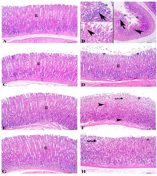 Photomicrographs of the gastric tissue in the experimental groups. (A) Control group, regular stomach mucosa with surface epithelium and glandular cells (g). (B) Severe damage to surface epithelium (*), hemorrhage (arrowhead), and inflammatory cell infiltration (arrow) in untreated ulcer groups. (C) Fish oil-treated control group, regular glandular cells (g) and surface epithelium. (D) Fish oil-treated ulcer group micrograph demonstrates nearly regular glandular cells (g) and mild degeneration in surface epithelium (*). (E) Krill oil-treated control group, regular glandular cells (g) in the stomach mucosa. (F) Krill oil-treated ulcer group, significant damage in surface epithelium (*), degeneration in glandular cells (wavy arrow), and hemorrhage (arrowhead). (G) Astaxanthin-treated control group, regular glandular cells (g) in the gastric mucosa. (H) Astaxanthin-treated ulcer group, mild dilated gastric glands (wavy arrow), and minimal degeneration at surface epithelium. (Hematoxylin and eosin staining, bars: 100 µm).