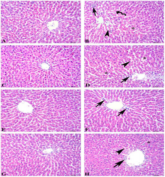 Photomicrographs of the liver tissue in the experimental groups. (A) Control group, regular histology of liver tissue. (B) Ulcer group, degenerated hepatocytes (wavy arrow), inflammatory cell infiltration (arrow), dilatation (arowhead), and vascular congestion in sinusoids (*). (C) Fish oil-treated control group, regular histology of liver tissue. (D) Fish oil-treated ulcer group, degeneration findings similar to ulcer group: inflammatory cell infiltration (arrow), dilatation in sinusoids (arowhead), and vascular congestion (*). (E) Krill oil-treated control group, regular hepatocytes and central vein. (F) Krill oil-treated ulcer group, regression in hepatocyte degeneration and decrease in inflammatory cell infiltration (arrow). (G) Astaxanthin-treated control group, regular hepatocytes and central vein. (H) Astaxanthin-treated ulcer group, decrease in sinusoidal congestion (*), sinusoidal dilatation (arrowhead), and inflammatory cell infiltration (arrow). (Hematoxylin and eosin staining, bars: 100 µm).