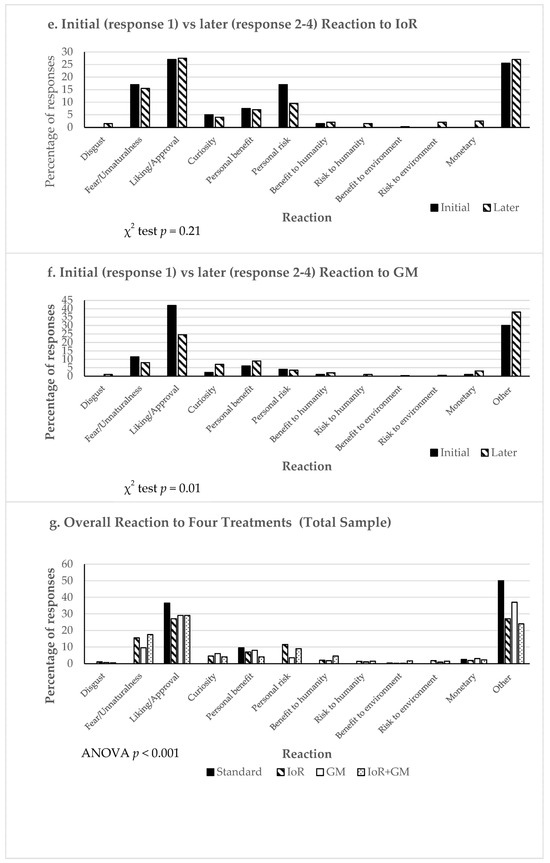 The last chart (Figure 1g) indicates the overall frequency from R1 and R2 of free-text responses across the four treatments: GMIoR (GM and IoR), GM, IoR, and SF (standard fruit). While the category of liking/approval for IoR exhibits a high frequency of responses, it has the lowest overall frequency compared to the other three treatments. Likewise, the liking/approval category maintains a consistently high frequency of responses across all treatments. This indicates that consumers interpret the survey instructions for their reactions to the four treatments. Yet, they tend to streamline the complex information into a more familiar concept [103], resembling consumers’ positive responses when encountering a strawberry. Regarding cognitive reactions, once again, the frequency of responses is highest for the personal risk associated with IoR.