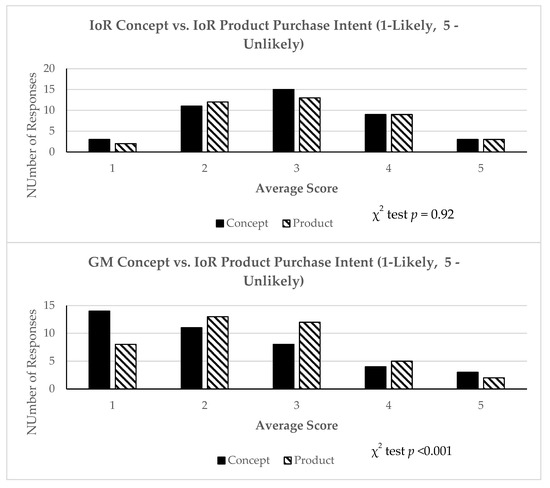 Comparing the response profiles of IoR and GM (Figure 2) as concepts and when presented as products, it is evident that IoR responses tend to cluster around the neutral mean, while GM responses exhibit a significantly higher percentage of positive reactions (indicating a greater likelihood of purchase). The IoR concept and product illustrate a relatively similar response variance, whereas the GM concept shows a higher purchase probability than the GM product. This implies that the perception or idea of GM food conveyed by the concept was more positively received in terms of purchase intention than the specific GM product presented. It could indicate a disparity between the abstract notion of GM food and the tangible product regarding consumer acceptance or willingness to buy.