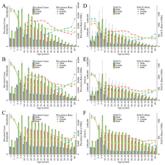 Number and rate of ID in 1990, 2021, and 2050 at the global level by gender and age groups. (A–C) Prevalent case and prevalence rate in 1990 (A), 2021 (B), and 2050 (C). (D–F) DALYs and DALYs rate in 1990 (D), 2021 (E), and 2050 (F). Abbreviations: ID, iron deficiency; DALYs, disability-adjusted life years.
