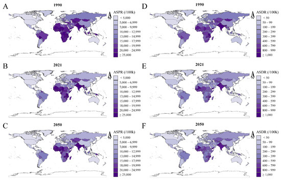 At the regional level, in 1990, the highest ASPRs were observed in South Asia, Central Sub-Saharan Africa, and Western Sub-Saharan Africa, with 36,430/100,000, 25,700/100,000, and 24,938/100,000, respectively. In 2021, the highest ASPRs were in South Asia, Western Sub-Saharan Africa, and Oceania, at 31,696/100,000, 26,159/100,000, and 21,731/100,000, respectively. By 2050, the highest ASPRs are projected to be in South Asia, Western Sub-Saharan Africa, and Oceania, with rates of 30,074/100,000, 26,045/100,000, and 21,120/100,000, respectively (Table 1 and Table S2). The highest EAPCs in ASPR were observed in High-income North America (EAPC: 0.25, 95% CI: 0.04 to 0.46), Western Sub-Saharan Africa (EAPC: 0.19, 95% CI: 0.15 to 0.23), and the Caribbean (EAPC: 0.03, 95% CI: −0.07 to 0.14) from 1990 to 2021. Between 2021 and 2050, the largest EAPCs in ASPR are predicted in East Asia (EAPC: 0.35, 95% CI: 0.32 to 0.38), High-income Asia Pacific (EAPC: 0.16, 95% CI: 0.12 to 0.20), and Western Sub-Saharan Africa (EAPC: −0.01, 95% CI: −0.01 to 0.01) (Table 1 and Table S3).