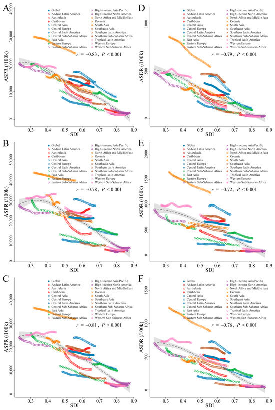 The correlation between the SDI and both ASPR and ASDR at the regional level, stratified by gender, was analyzed over the period from 1990 to 2021. The analysis revealed a significant negative correlation between the ASPR and SDI, indicating a decline in the ASPR with increasing SDI (male: r = −0.83, p < 0.001; female: r = −0.78, p < 0.001; both genders combined: r = −0.81, p < 0.001). Similarly, the ASDR showed a general downward trend with rising SDI during the same period (males: r = −0.79, p < 0.001; females: r = −0.72, p < 0.001; both genders combined: r = −0.76, p < 0.001) (Figure 7).
