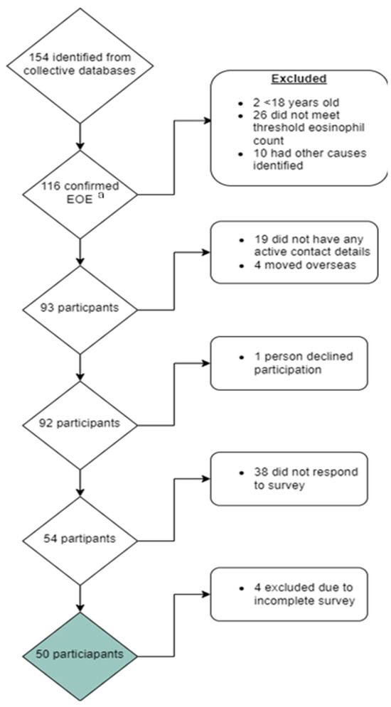 Consort diagram reporting those approached and included for participation in this study exploring quality of life in patients with eosinophilic oesophagitis (EoE). a Eosinophilic oesophagitis. Green box: Total number of final participants included in study.