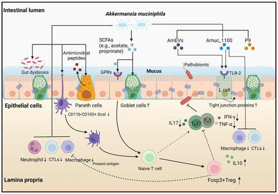 Despite the growing body of evidence suggesting that Akk is a promising probiotic, the exact mechanisms by which it exerts its beneficial impact on health have not been fully elucidated (Figure 1). Studies have shown that Akk promotes the gut production of short-chain fatty acids (SCFAs), improving insulin resistance and host metabolism—factors linked to obesity and diabetes [12,13,14,15]. Moreover, Akk has been shown to modify the gut microbiota by stimulating other beneficial gut bacteria such as Bifidobacteria, thereby promoting a healthier gut ecosystem [13].