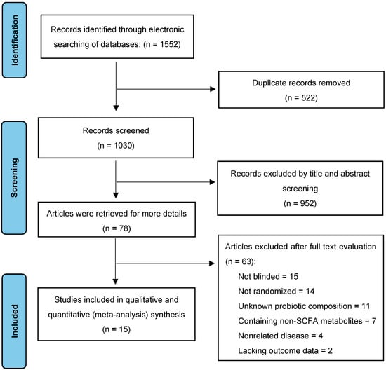 A comprehensive literature search was conducted in January 2024, yielding 1552 citations across four databases: PubMed (461), Cochrane Library (52), EMBASE (336), and Web of Science (703). After removing duplicates and conducting title and abstract screenings, 1030 studies were deemed potentially relevant for further evaluation. Of these, 952 of these studies were excluded due to irrelevance or methodological shortcomings. A full-text review of the remaining 78 studies led to the exclusion of 63 studies due to methodological issues (15 non-blinded, 14 non-randomized, 11 unknown probiotic composition) or irrelevant outcomes (seven reporting non-SCFA metabolites, four involving unrelated diseases, and two with missing outcome data). Ultimately, 15 studies met our inclusion criteria, encompassing a total of 586 animals and were selected for data analysis and extraction [30,31,32,33,34,35,36,37,38,39,40,41,42,43,44]. The search flow details are depicted in Figure 2.