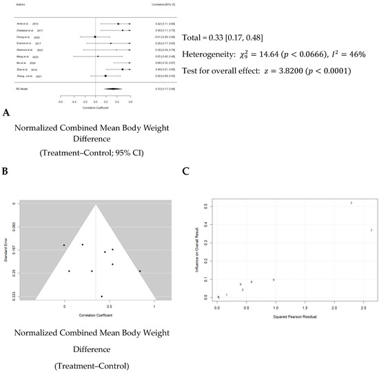 Quantitative analysis of studies that assessed body weight using a random-effects meta-analysis. (A): Forest plot of studies investigating body weight effects (normalized mean difference 95% CI) [31,32,33,34,36,40,41,42,43]. Effect size estimates were heterogenous, likely owing to study design differences. (B): Funnel plot used to assess publication bias. These results suggest that the studies used in the meta-analysis had relatively low publication bias (i.e., the symmetric distribution of closed circles). (C): Baujat plot used to assess the studies that contributed most to heterogeneity. These results suggest that studies Chung et al. 2020 [33] and Wu et al. 2020 [41] likely had moderating variables that contributed the most to the heterogeneity.