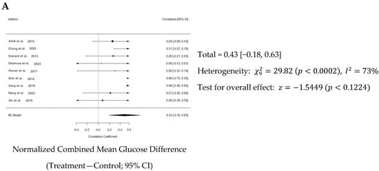 Nine studies evaluated the effect of Akk on glucose tolerance (Table 5). In total, 111 animals were in the control groups, while 123 received treatment. On average, Akk treatment led to a 22.1% improvement in glucose tolerance, as estimated by the 2 h area under the curve (AUC) for blood glucose following a glucose tolerance test. Since the exact AUC values were not provided in all the selected studies, these estimates were derived from the individual study graphs using an image analysis program (https://imagej.nih.gov/ij/, accessed on 10 March 2024). The effect sizes varied. While three studies showed significant reductions in AUC, the majority reported only minor, non-significant decreases.
