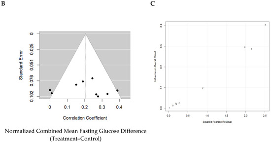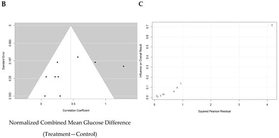 Overall, a weighted mean effect size of 0.347 (95% CI: 0.18–0.63) indicated a statistically significant reduction in blood glucose levels due to Akk treatment. Forest plot analysis confirmed this, revealing a pooled effect size of 0.43 (95% CI: 0.18–0.63; p < 0.001, Figure 5A). A random-effects model was used to account for heterogeneity between studies, which was substantial (I2 = 73%). Nonetheless, the funnel plot suggested low publication bias (Figure 5B). The study by Shin et al. primarily contributed to the observed heterogeneity (Figure 5C).