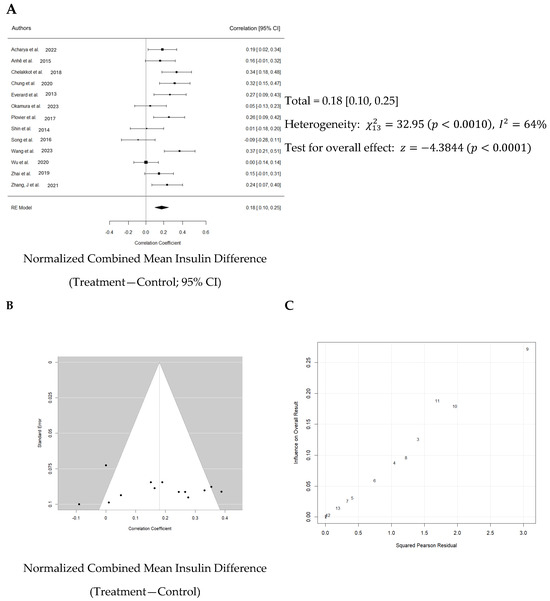 Normalized effect sizes varied across studies, with most studies showing positive effect sizes, suggesting that the treatment generally had a beneficial effect. Nevertheless, only seven of 13 studies showed that the effect was significant. The weighted mean effect size of 0.827 with a confidence interval of 0.10 to 0.25 indicates a statistically significant reduction in blood glucose levels due to Akk treatment. The forest plot also revealed a significant increase in blood insulin levels in animals administered Akk compared to controls (p < 0.001) as shown in Figure 6A. The analysis showed a pooled effect size of 0.18 (95% confidence interval: 0.10–0.25). There was significant variation in the study results (I2 = 64%). Additionally, the analysis suggests a potential publication bias (Figure 6B). These results indicate that the studies by Shin et al., Song et al. and Wang et al. contributed the most to the observed heterogeneity (Figure 6C).