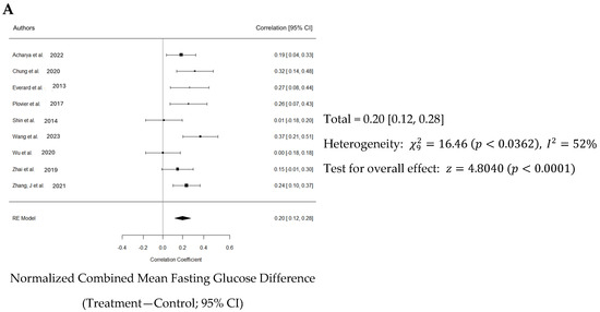 Nine studies measured glucose tolerance. The meta-analysis showed that Akk significantly improved glucose tolerance in mice by reducing the 2 h AUC by 22.1%. However, there was substantial variation in the results across studies, as reflected by I2 = 73%. Indeed, six of nine studies showed modest but non-significant effects. The median duration of Akk treatment across studies was 12 weeks, ranging from 6 to 16 weeks. Shin et al. found that six weeks of Akk treatment significantly reduced DIO mice 2 h AUC by an estimated 27.3%. This mouse study of Akk treatment showed the most prominent effect among the studies with a normalized effect size of 0.856. Plovier et al. also investigated six weeks of Akk treatment on mouse glucose tolerance but with a lower dose (2 × 108 CFU/d versus 1 × 1010 CFU/d in Shin’s study) and found no significant effect. The other two studies with significant effects by Akk treatment also used doses at or above 1 × 1010 CFU/d, suggesting that the Akk treatment dose may need to be no less than 1 × 1010 CFU/d to be effective. It should be noted that one study by Wang et al. used a model of FFAR4 knockout mice, which has been shown to cause severely impaired glucose tolerance under high-fat feeding conditions. FFAR4 regulates glucagon-like peptide 1 secretion by modifying Akk abundance. However, our meta-analysis showed that Akk treatment at 5 × 1010 CFU/d for 12 weeks in Wang’s study did not significantly improve glucose tolerance. There was substantial heterogeneity among the studies. The studies differed in terms of doses, duration, sample size, and other factors, which could significantly influence the results. Further research is needed to confirm the consistency and magnitude of the effect of Akk on glucose tolerance. Overall, fasting blood glucose decreased by 21.2%, whilst blood insulin increased by 26.9% when comparing control to treatment groups likely because insulin and blood glucose are inversely correlated.