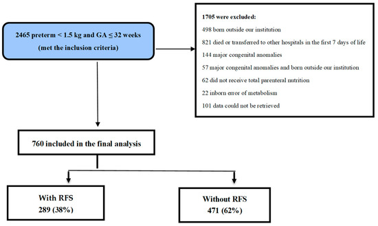 In total, 2465 preterm infants with a gestational age of ≤32 weeks and a birth weight of <1500 g were admitted to the level 3 NICU. Of them, 760 met the inclusion criteria and were eligible for the final analysis (Figure 1).